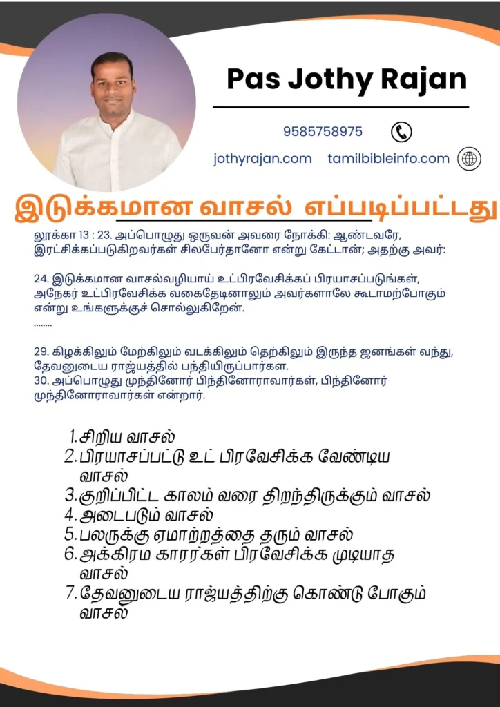 1 . சிறிய வாசல் – எல்லவற்றோடும் பிரவேசிக்க முடியாத வாசல்
